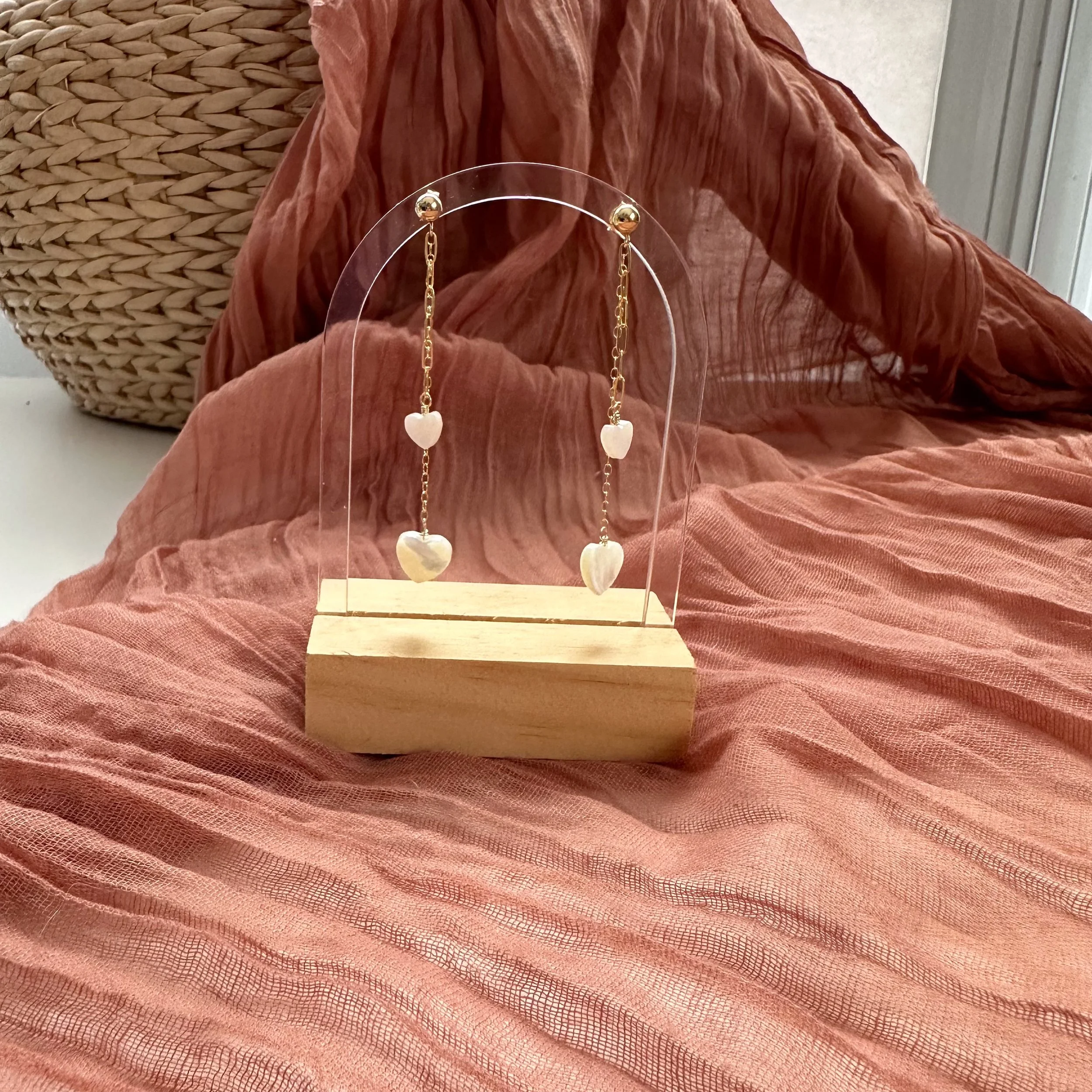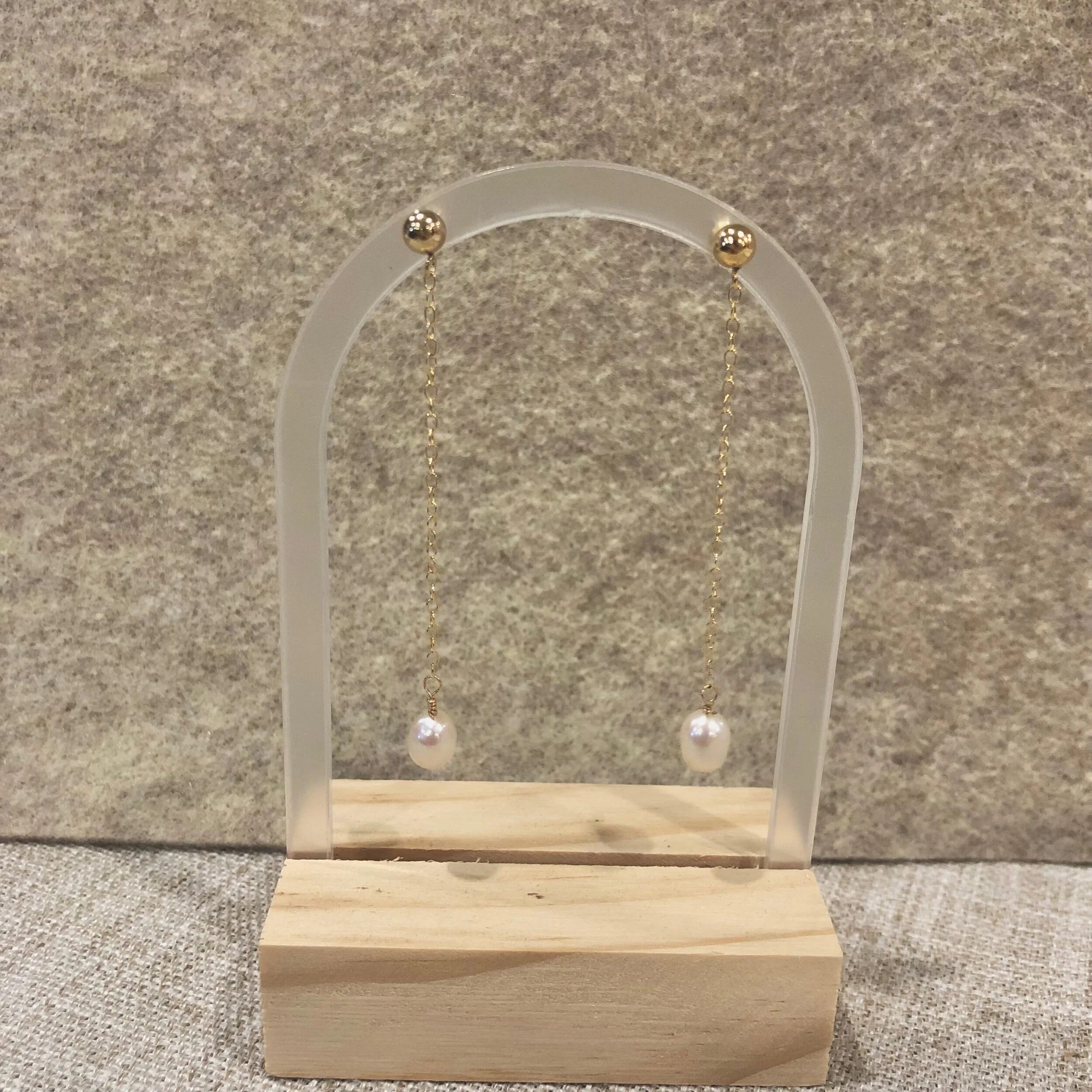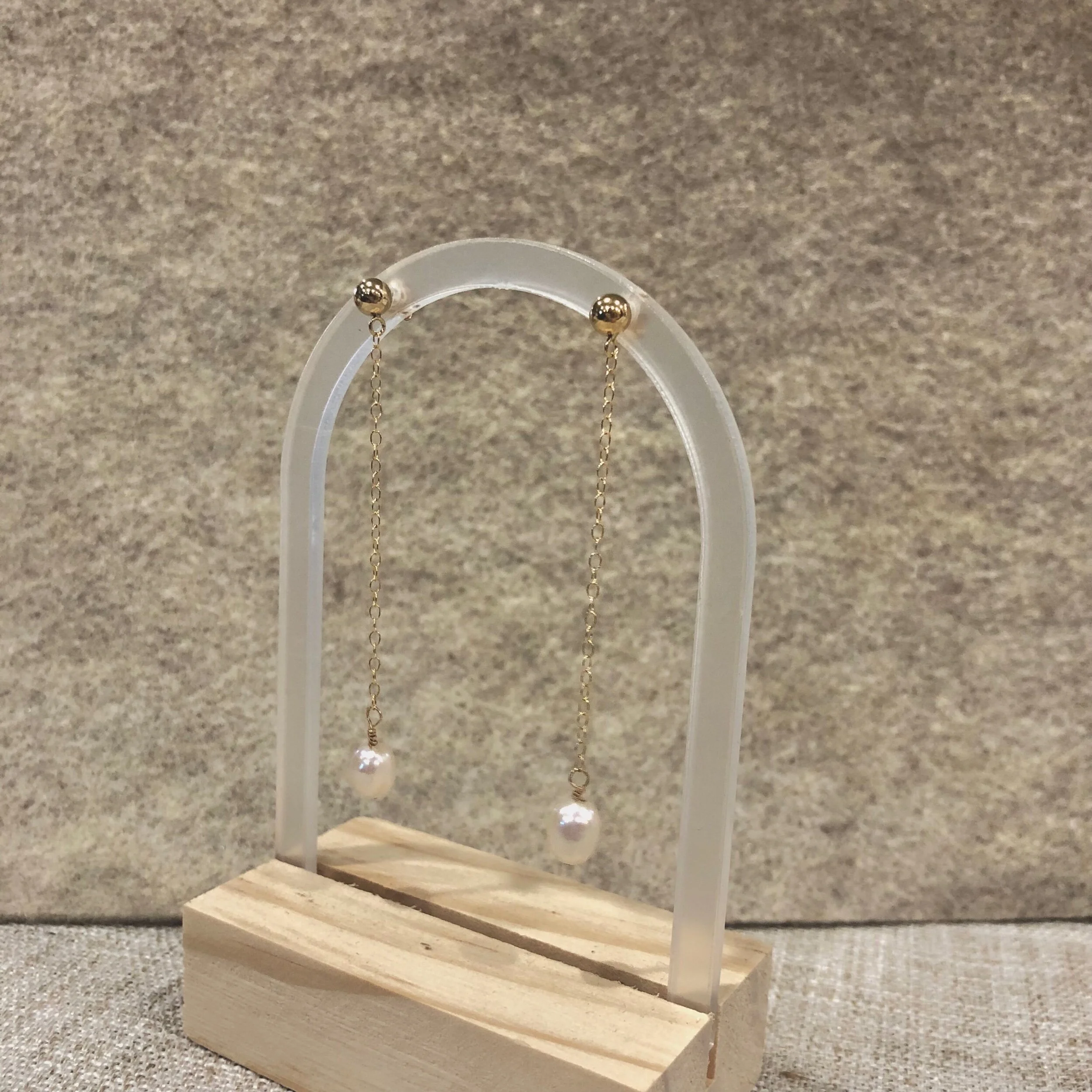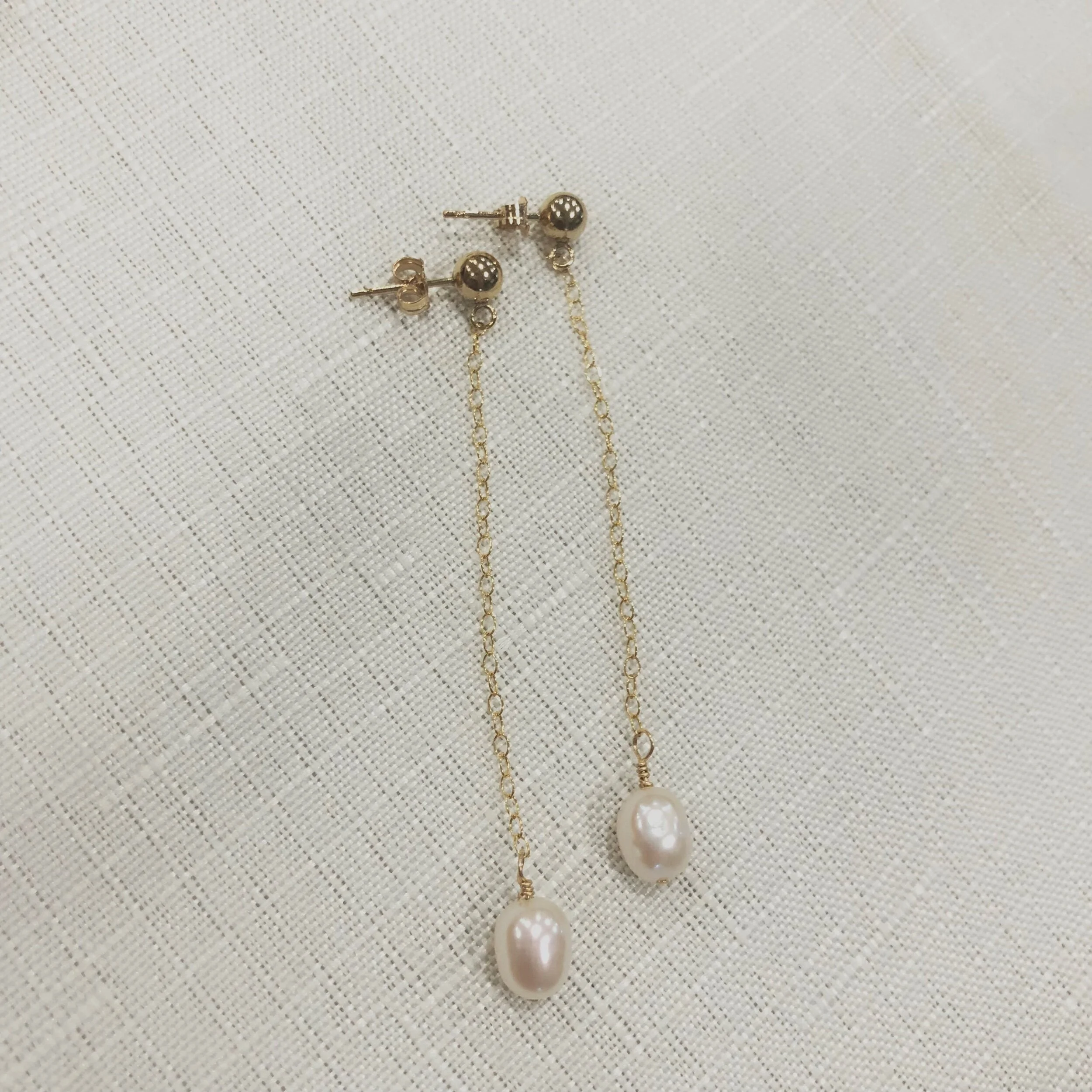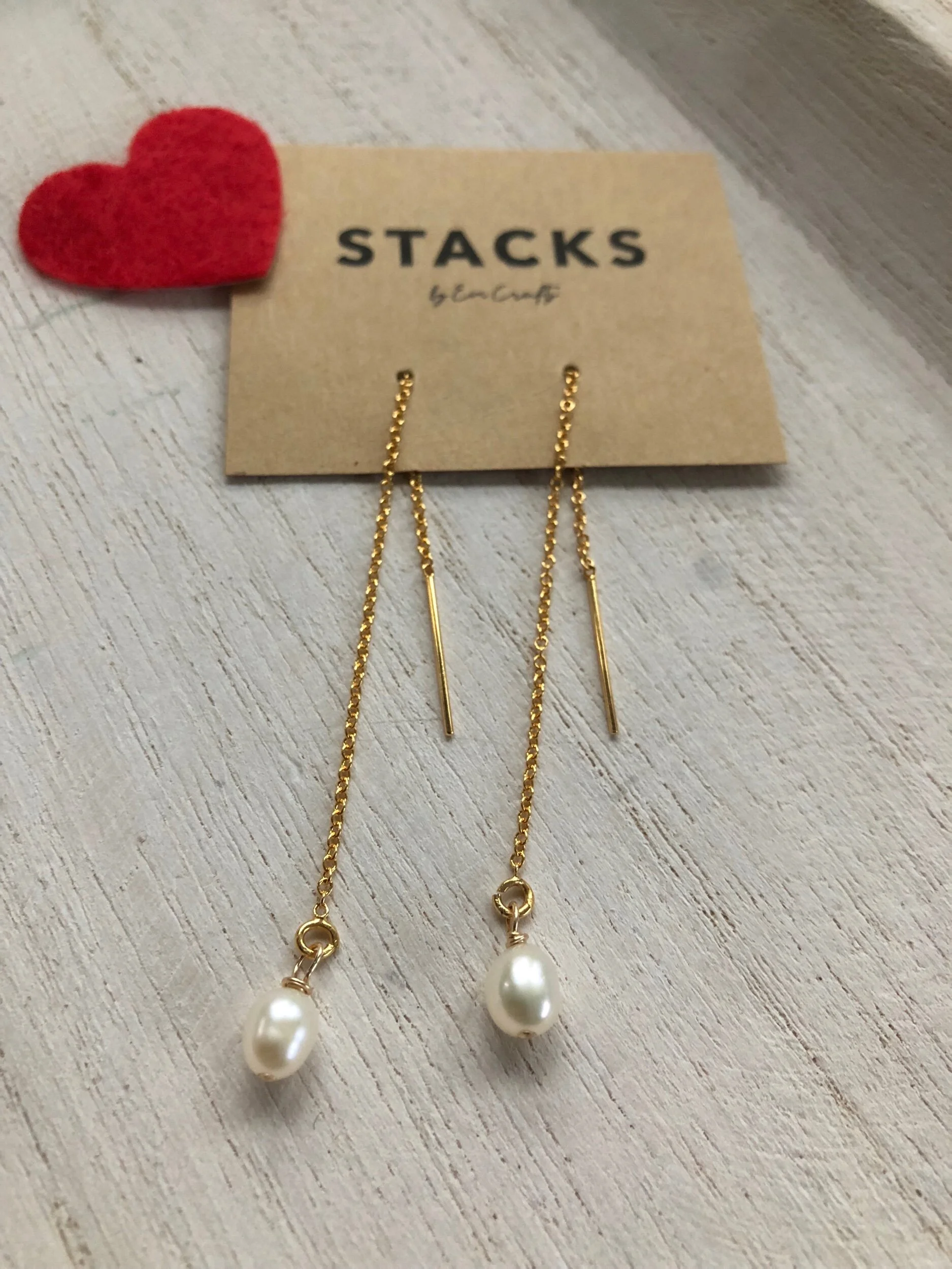 Made from gold filled & pearls with a chain that threads from the front to the backing of the earring making a hoop effect