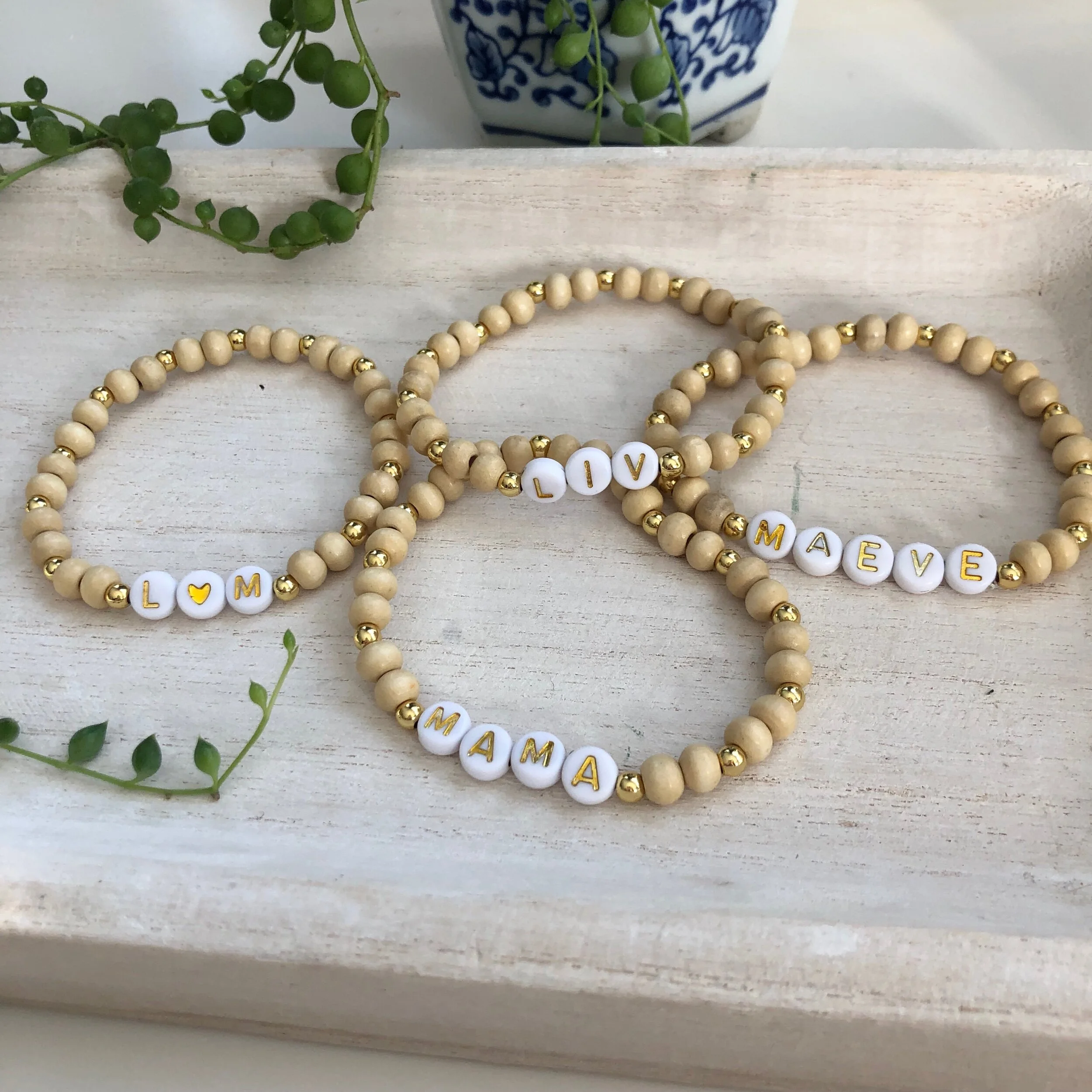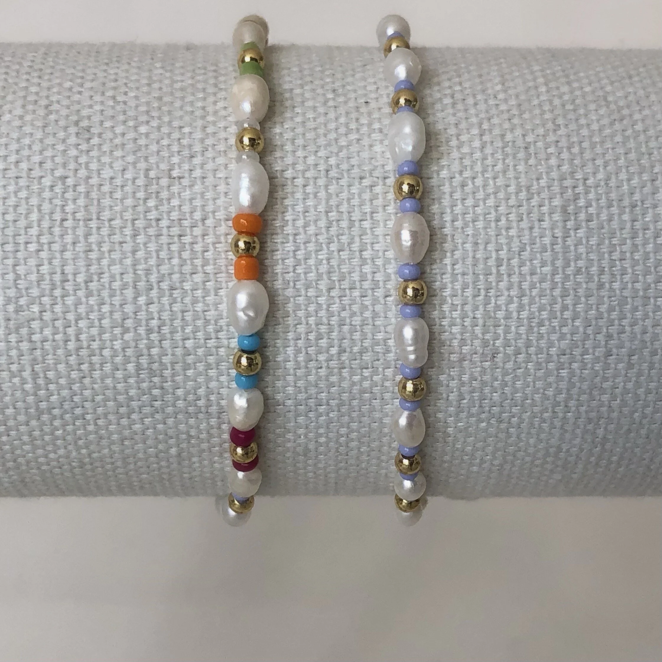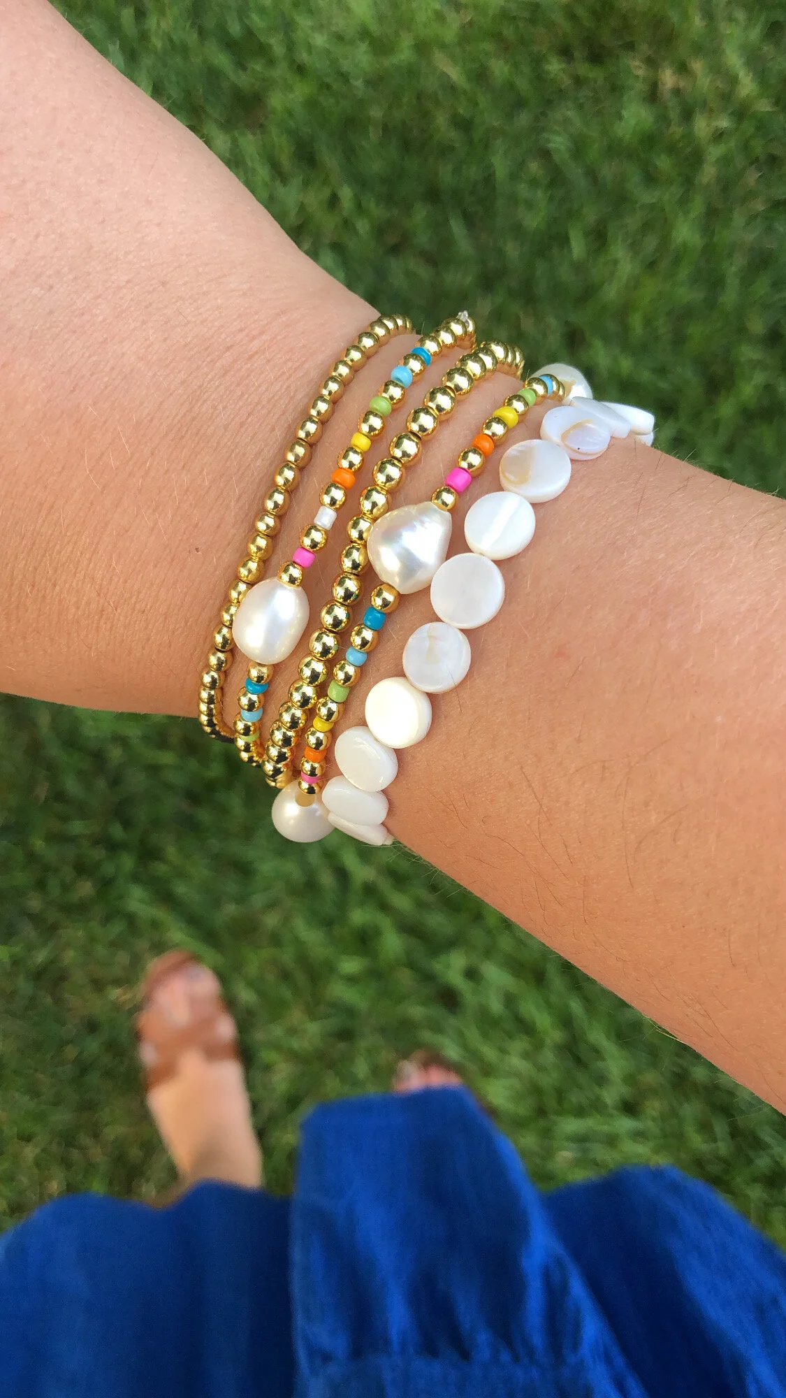 A stack of two stretchy bracelets with white, black, and gold-filled beads. Please specify your customization in the popup.