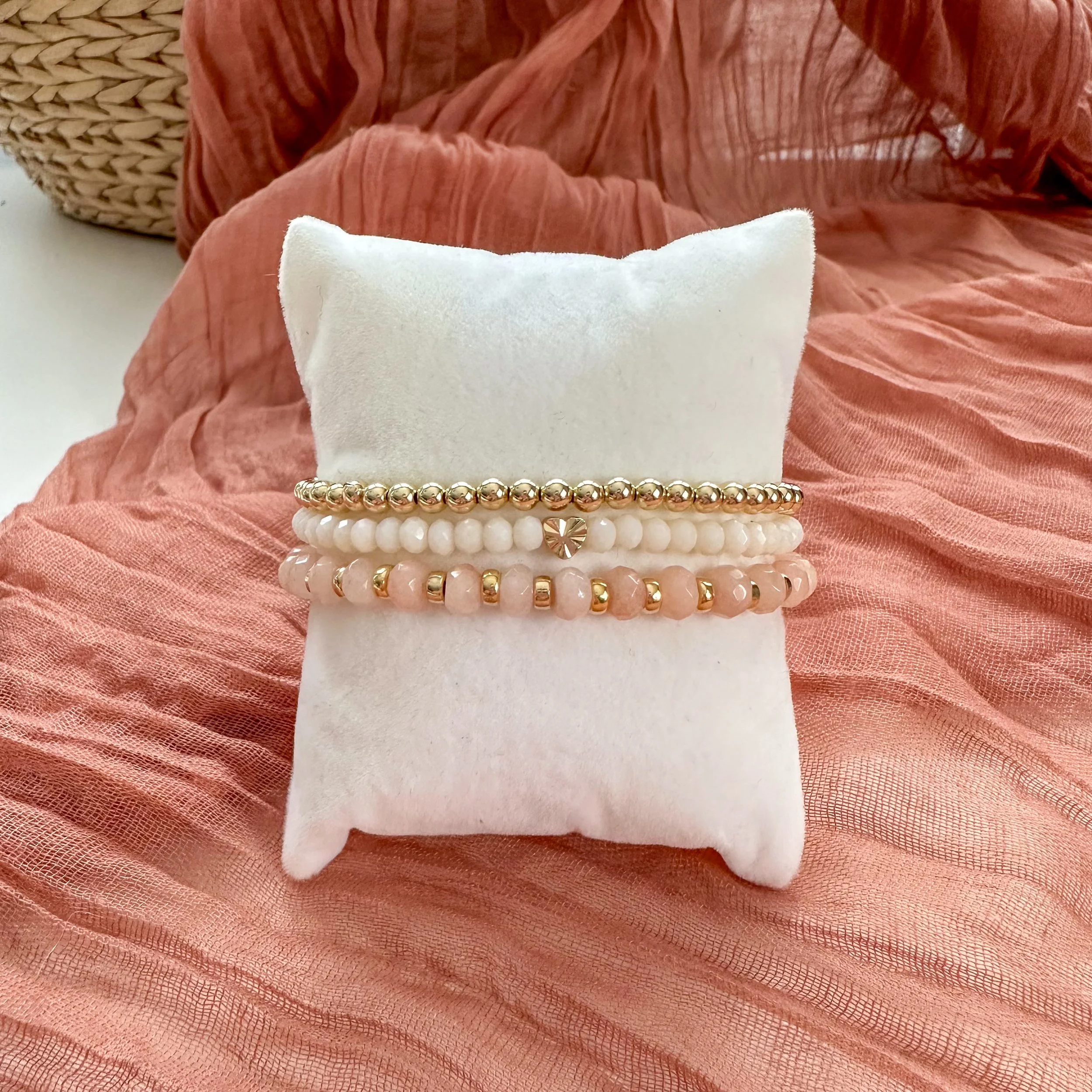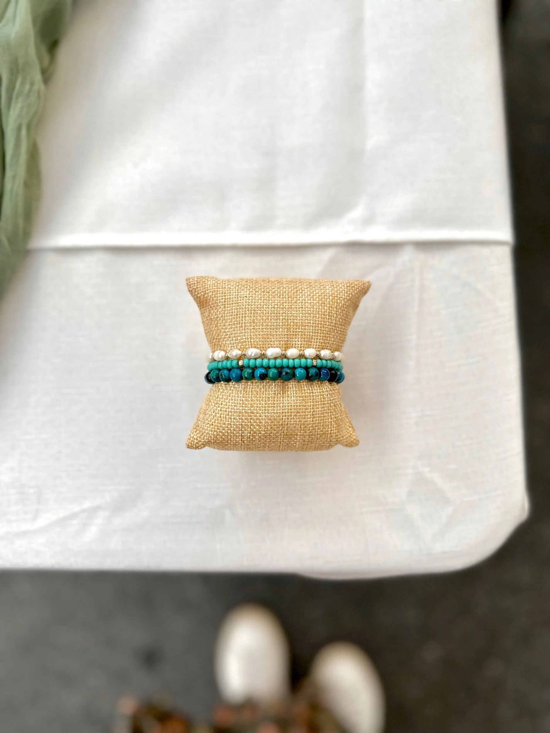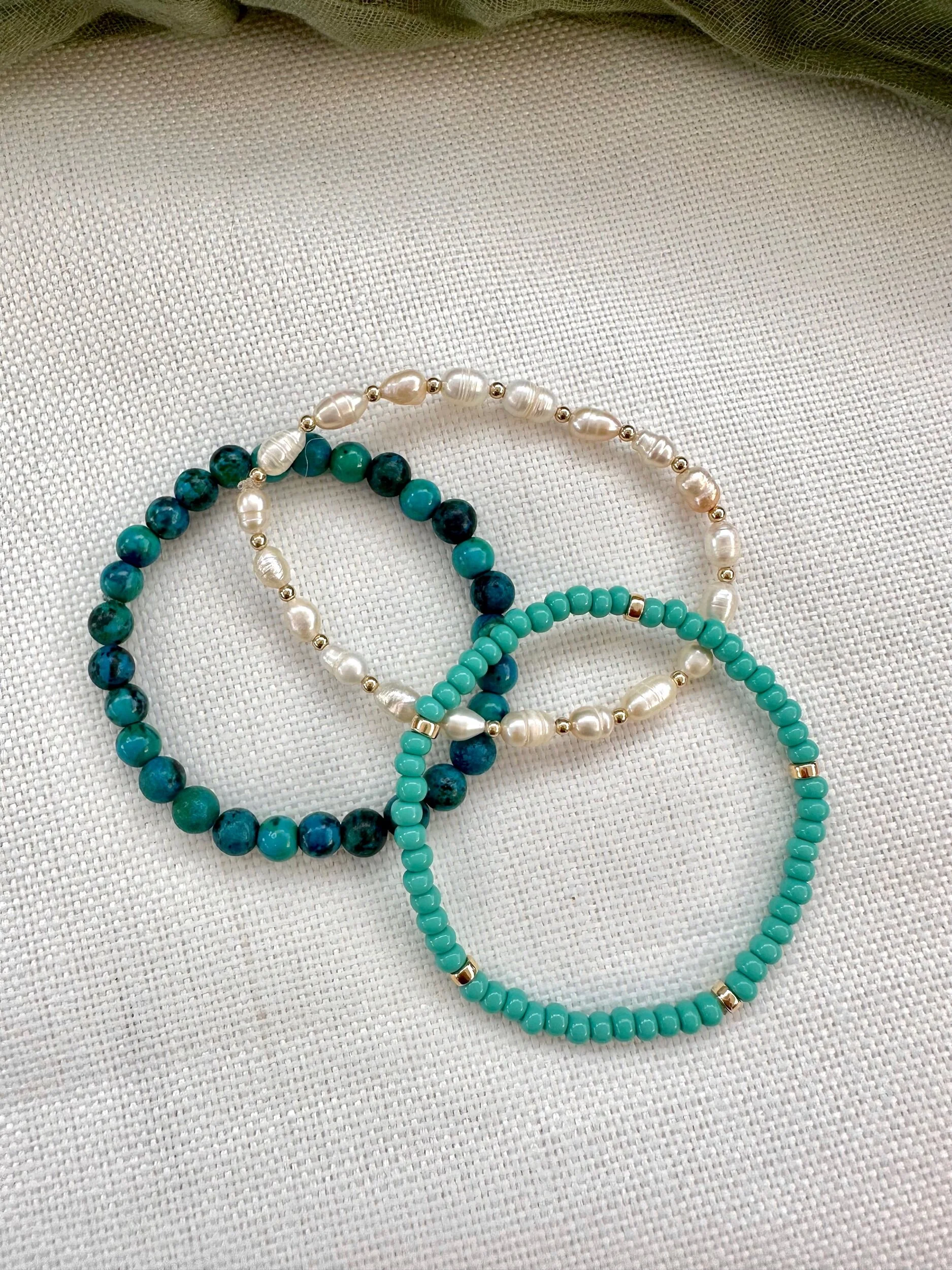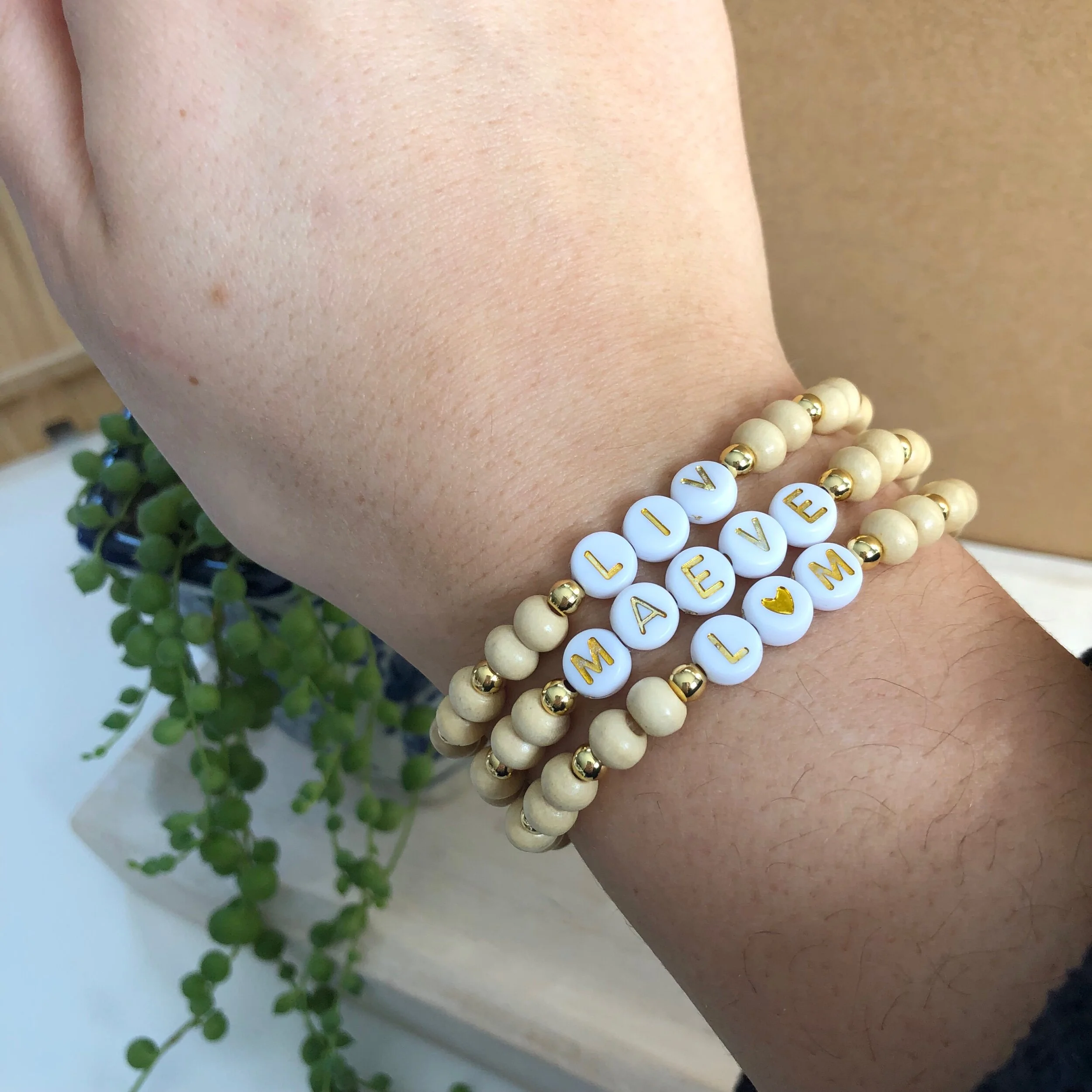 A stack of two stretchy bracelets with white, black, and gold-filled beads. Please specify your customization in the popup.